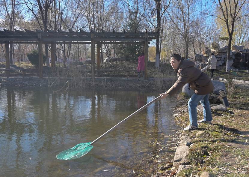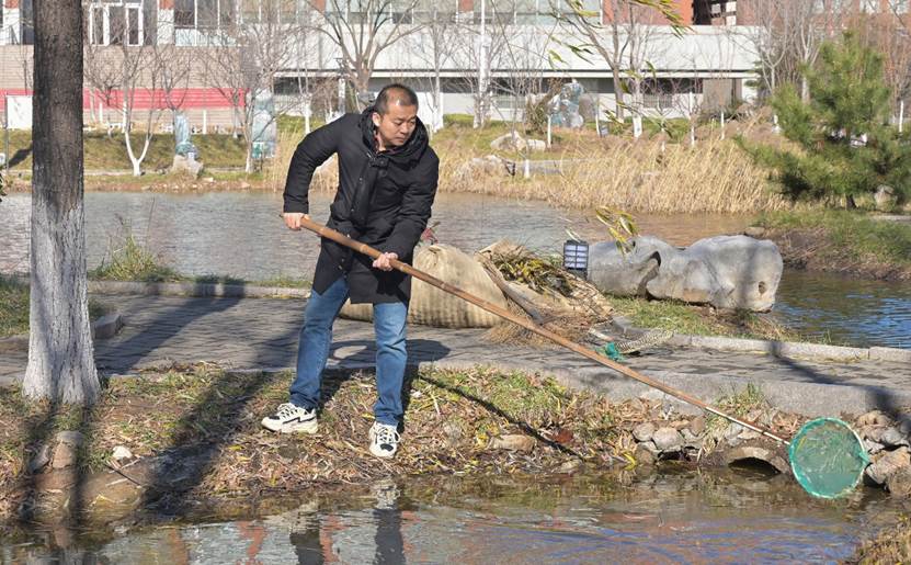 党员教师们不畏严寒,积极迅速地投入到清扫活动中。他们带着扫帚、竹篓、垃圾袋等劳动工具,分散在春华园各个角落,分工协作、有条不紊地对人工湖内的杂物、小路上的垃圾和树叶进行细致清理。经过教师们的共同努力,春华园内的环境焕然如新,湖水清澈见底,小路干净整洁。教师们在此次劳动中充分发挥了不怕苦不怕累的精神,体现了“劳动美”的深刻内涵。