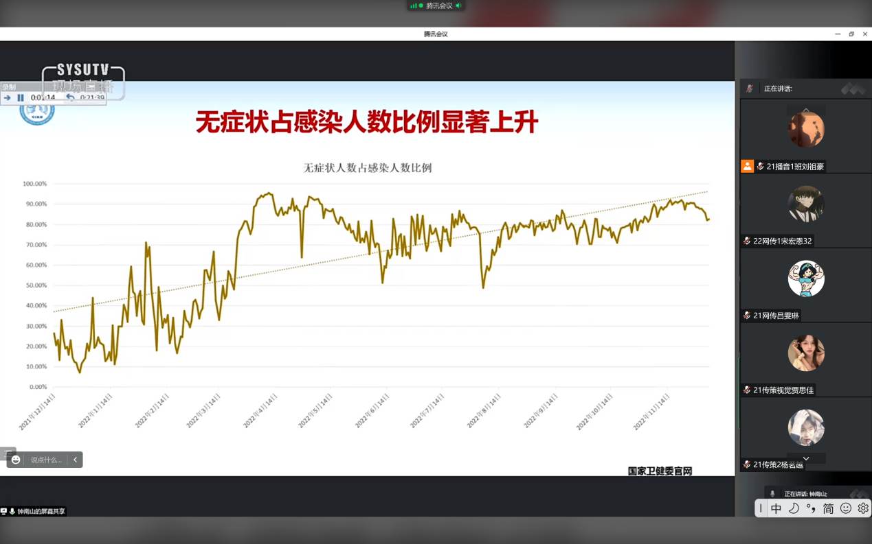 12月15日下午15点,“共和国勋章”获得者、中国工程院院士钟南山为全国高校学子上了一堂主题为《新冠(Omicron)疫情动态及应对》科普讲座。新闻传播系团总支组织各年级团支部线上积极观看。