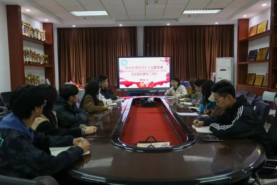 为深刻学习习近平总书记围绕党的青年工作发表的一系列重要论述,切实把关于青年工作的重要思想传播到青年中去,加强团组织建设,3月13日,新闻传播系团总支在行政楼A533开展主题团课,主要内容为研读《论党的青年工作》中,习近平总书记在庆祝中国共产主义青年团成立100周年大会上的讲话。系团总支书记吴娜,专职辅导员陶惠子、张雨晴及2022级学生干部参与本次团课。