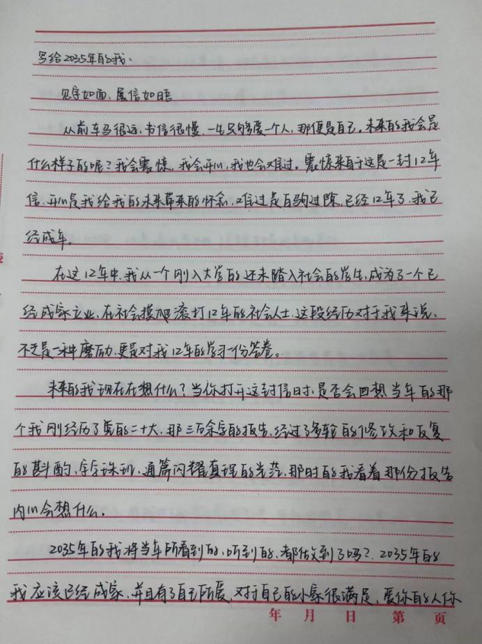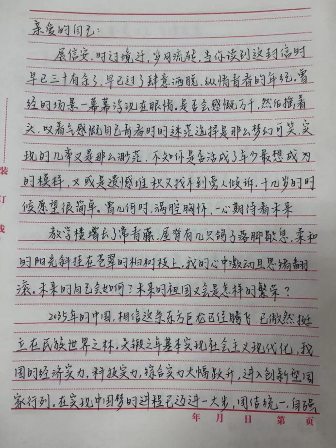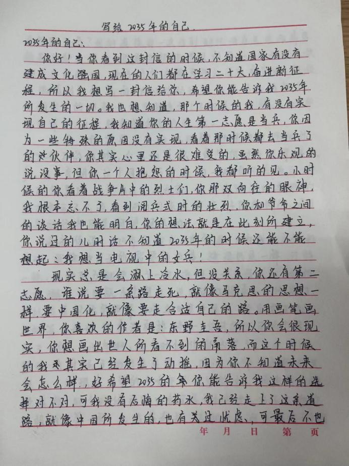 时光慢递,信笺载梦。活动要求用书信形式描绘2035年的自己理想状态。2035年是充满希望和憧憬的一年,党的二十大绘就了宏伟蓝图、吹响了前进号角。同学们以言筑梦,描绘心中所爱;横竖撇捺,写就四方之志。以下为本次活动优秀作品展示。