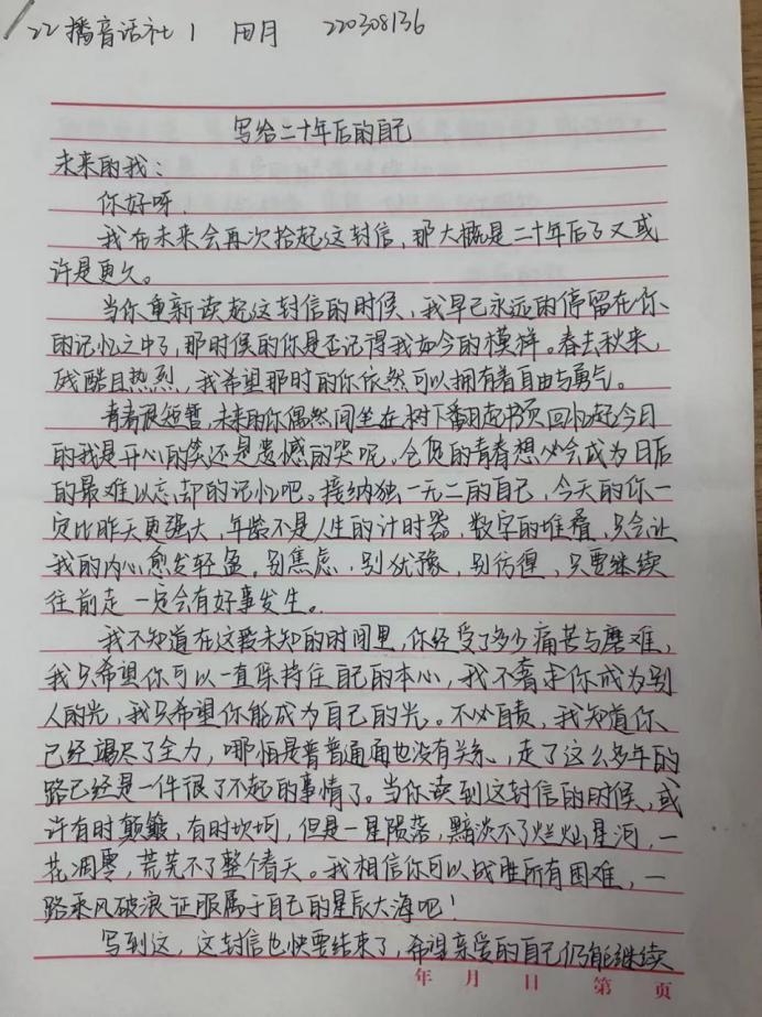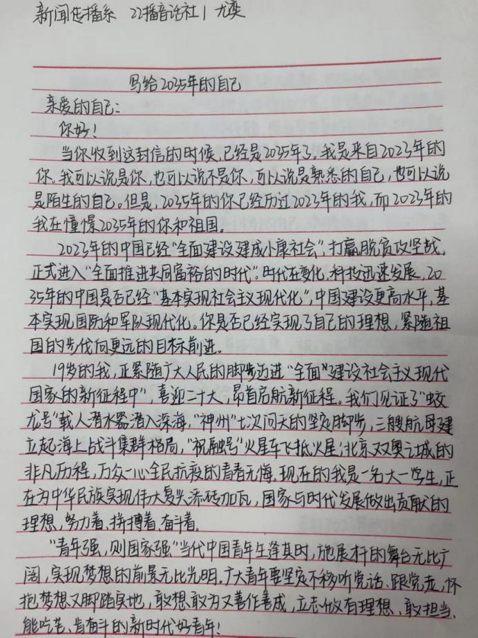 当时光飞逝,青年的勇气担当跟随着时代发展向前走,一切迈入了新阶段,你想对多年后的自己说些什么。3月6日起,新闻传播系开展了“以青春之名 学习党的二十大——写给2035年的自己一封信”主题活动。本次活动中,同学们踊跃报名参与,畅想着一个充满希望与光明的前路,一字一句写下寄给未来的书信。