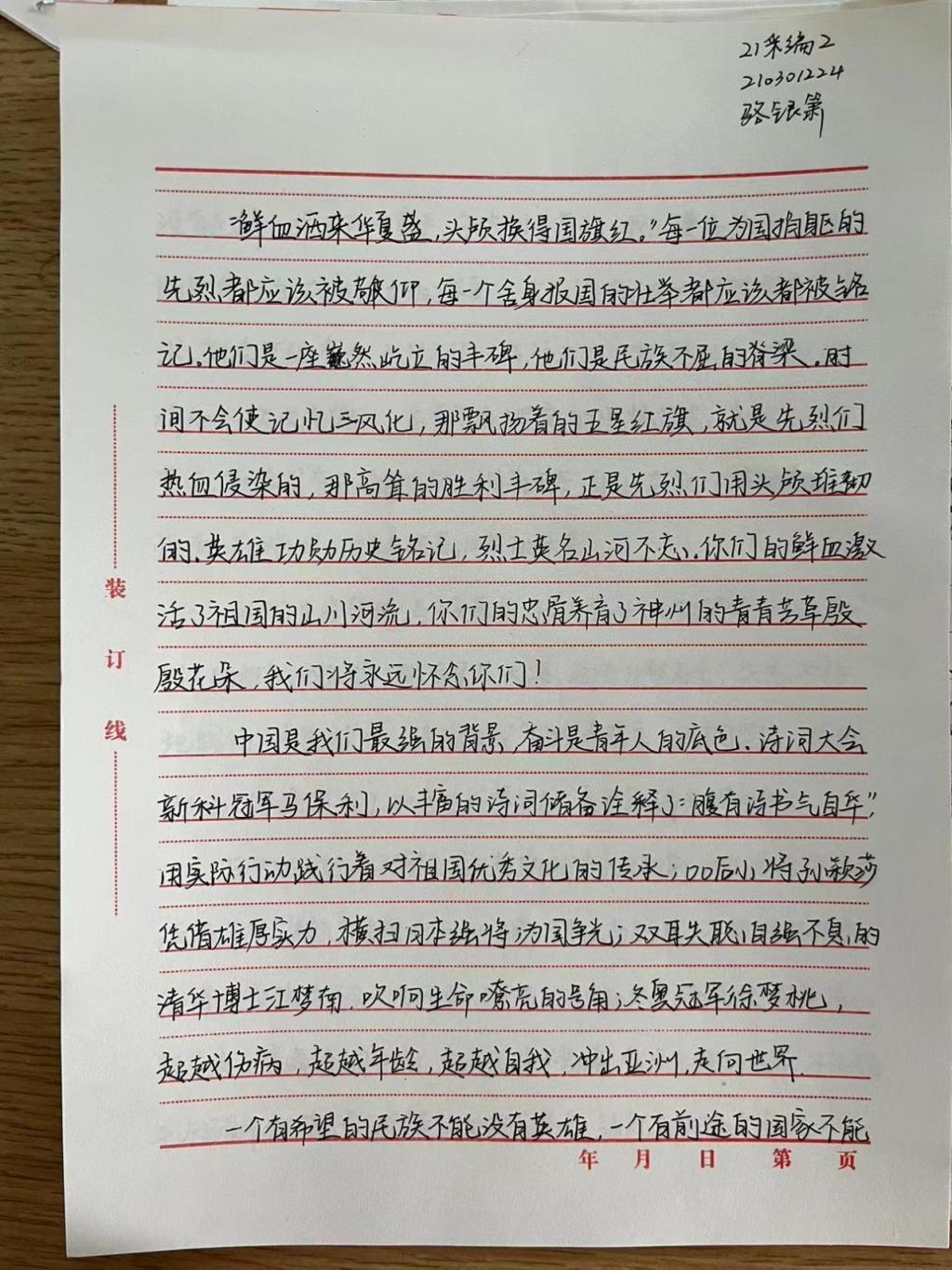 此次征文活动在弘扬爱国主义精神的同时激发了同学们的民族自信心和自豪感,激励着我系青年学子报效祖国,担负起时代责任,未来我系将继续举办丰富有内涵的红色经典文化活动,把爱国热情与专业素养相结合,培养更多有理想、有道德、有担当的社会主义青年。