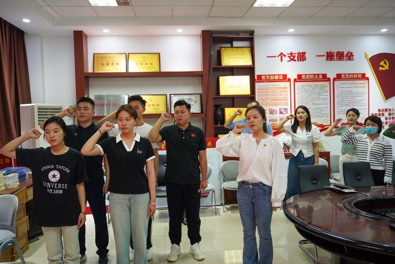白茹带领5名预备党员进行入党宣誓,全体党员高举右手紧握拳头,目光坚定,郑重的表示着对党组织的崇高敬意。