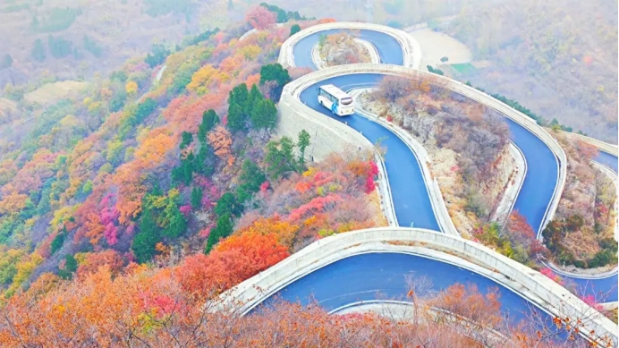 采风团沿着山上著名的九龙盘公路上山,九龙盘全长3300余米,盘山回旋,蜿蜒曲折,似群龙在山间起舞,左倚青山,右临幽谷,弯度急,坡度大,十分考验车技。