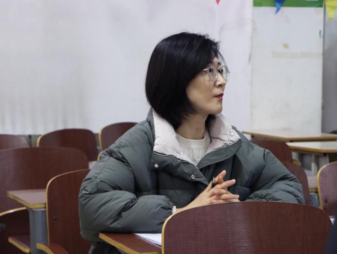 新闻传播系教学秘书周颖听取教师授课内容中